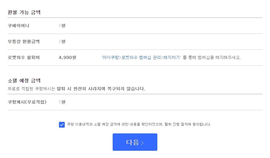 쿠팡 캐시나 적립금이 남아있다면 모두 사용하거나 환불받으세요. 탈퇴하면 모든 혜택이 즉시 소멸되고 복구가 불가능해요.