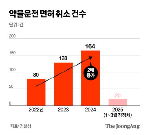반응속도 저하로 교통사고 가능성이 급격히 높아지며, 실제로 약물운전으로 인한 면허 취소 건수는 2022년 80건에서 2024년 160건으로 두 배 증가했습니다.