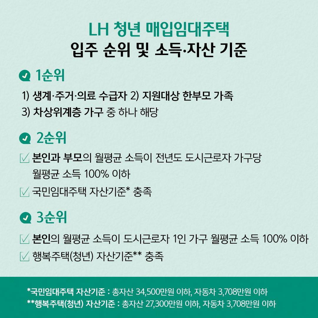 입주자격은 연령, 소득, 자산 세 가지 조건을 충족해야 합니다.
